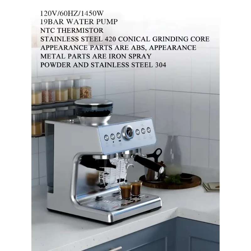 1.Caldeiras instantâneas: Alumínio fundido 120v 1200W 2.Bomba de água 19bar 3.Motor Keli: 150W 4.Aparência ABS + Aço Inoxidável 304