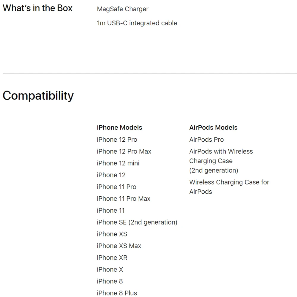 O carregador MagSafe mantém a compatibilidade com o carregamento Qi, por isso pode ser usado para carregar sem fio o seu iPhone 8 ou posterior, bem como os modelos AirPods com um estojo de carregamento sem fio, como faria com qualquer carregador certificado Qi.