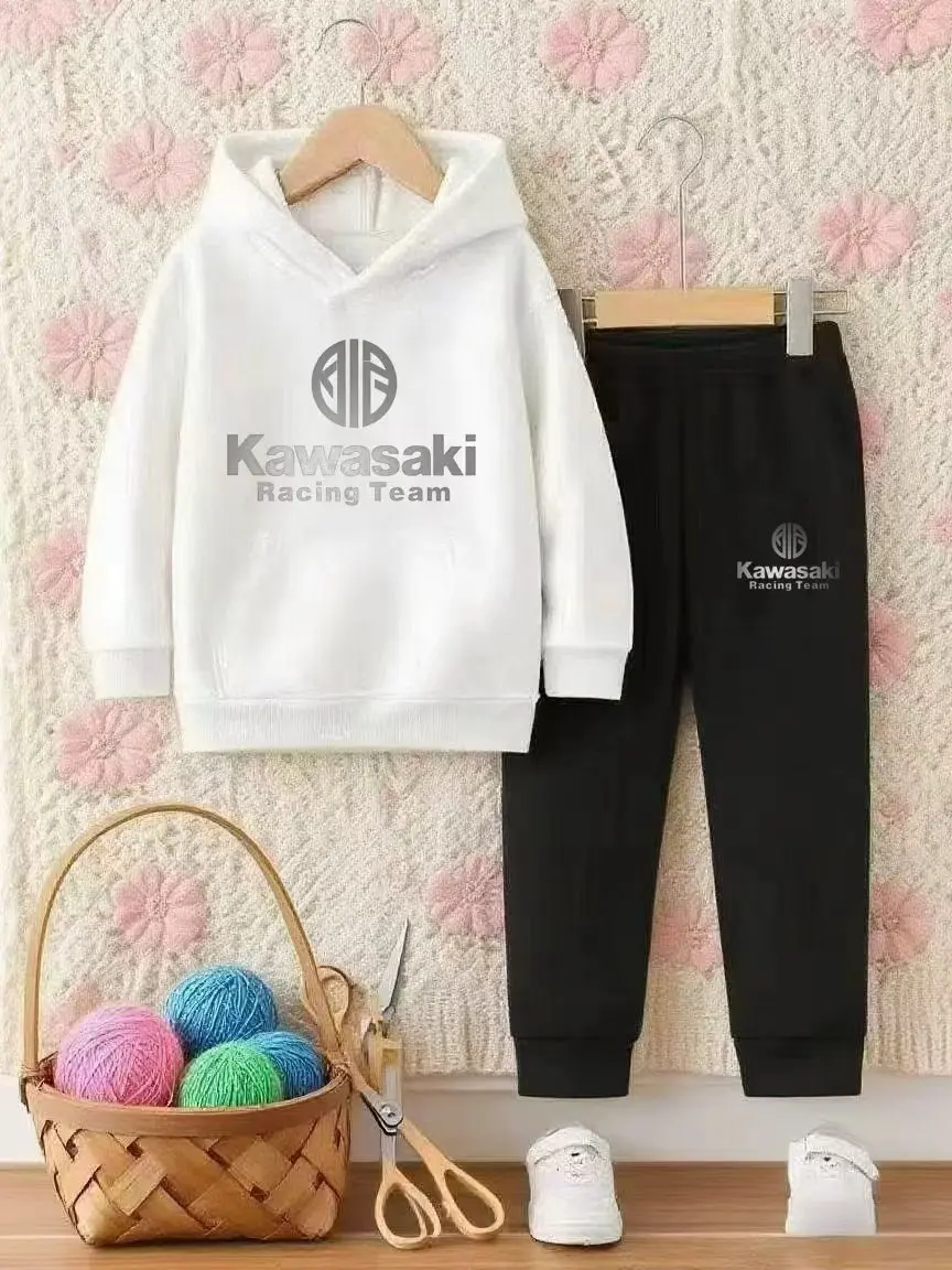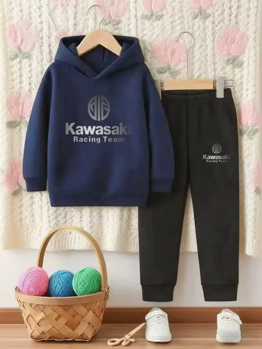 Conjunto de moletom com capuz estampado Kawasaki para crianças de 5 a 13 anos, conjunto casual de chapéu com capuz, conjunto de outono e inverno